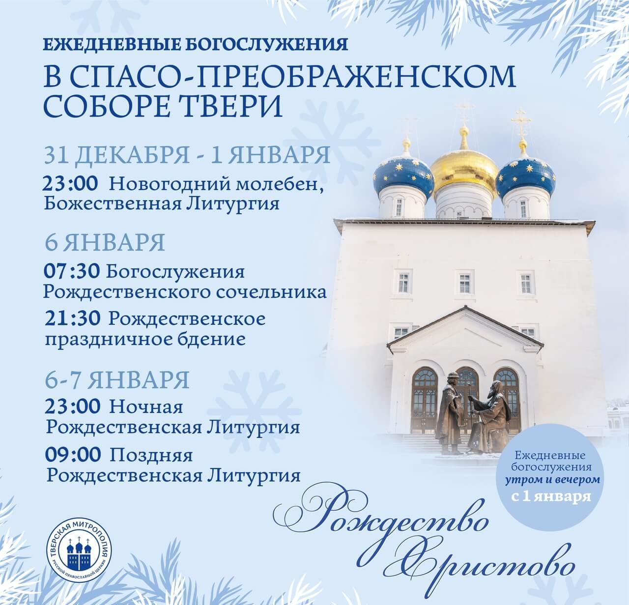 * 9:00 — Соборная архиерейская Божественная литургия в Воскресенском соборе г. Твери (ул. Баррикадная, 1).