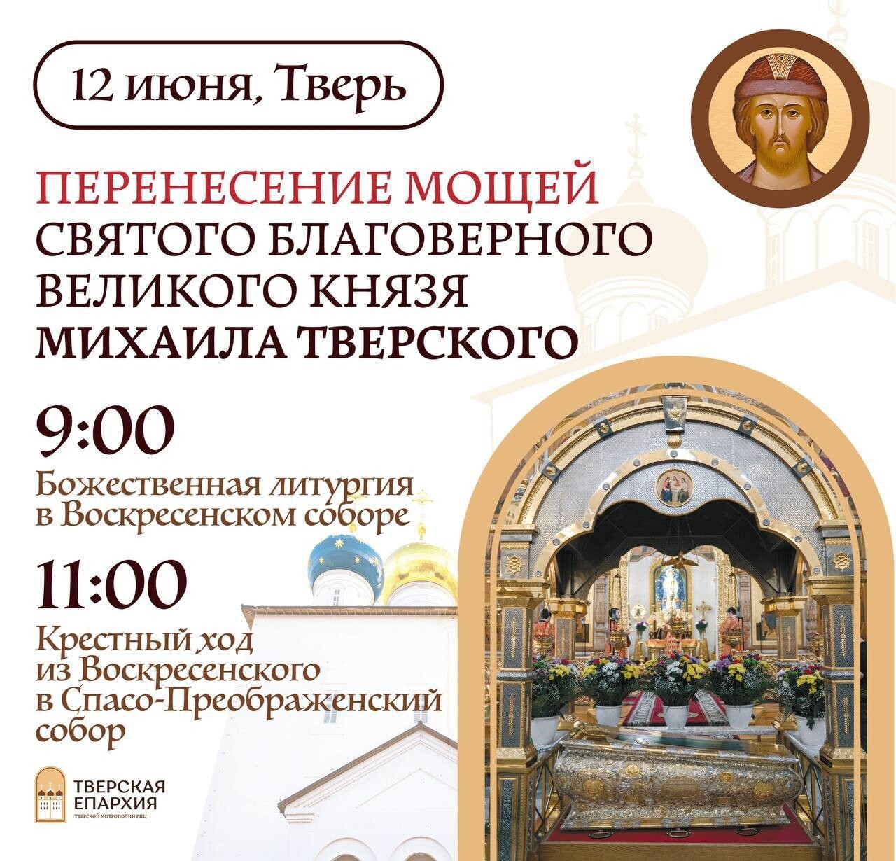 12 июня состоится историческое событие — торжественное перенесение мощей святого князя Михаила Тверского в Спасо-Преображенский кафедральный собор Твери